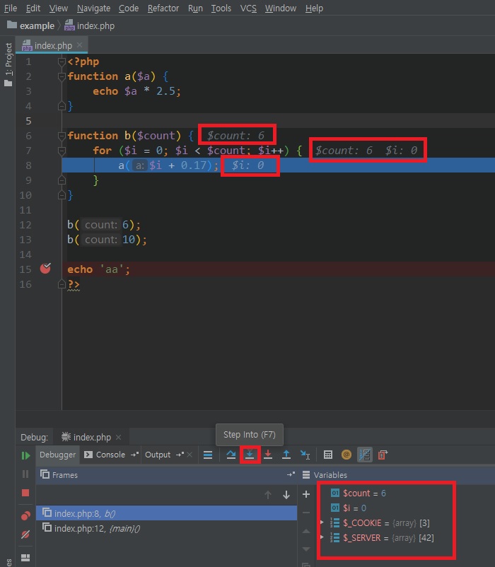 - 사이트가 리로드 되면서 멈춥니다. stip into 버튼을 누르면 코드가 한줄씩 실행되면서 변수에 어떤 값이 들어오는지 화면에 보여줍니다.