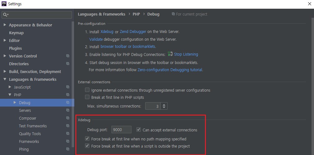 - settings->Laguages & frameworks -> php -> debug 로 갑니다.
