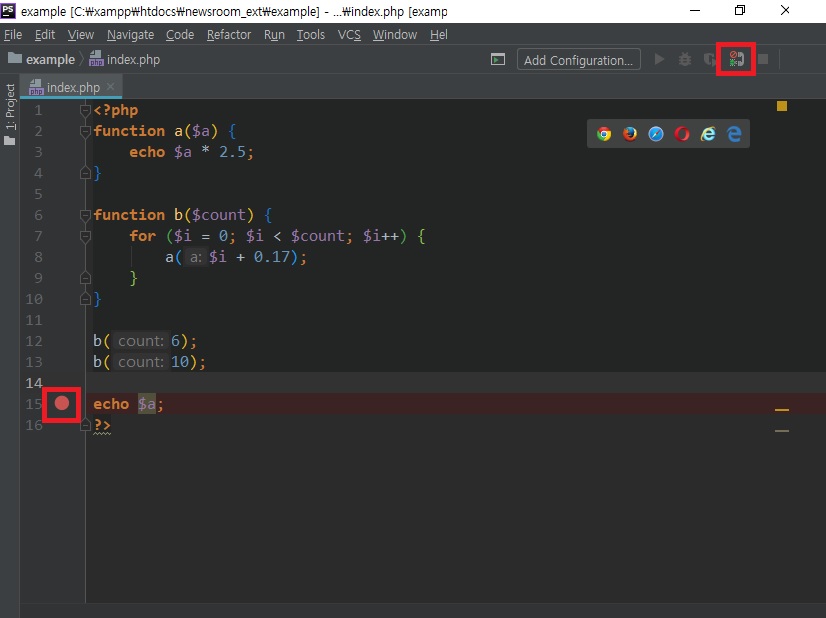 - 화면처럼 break point 찍어 주시고요. 오른쪽 위쪽에 버그와 전화기가 있는 마크를 눌러주세요.