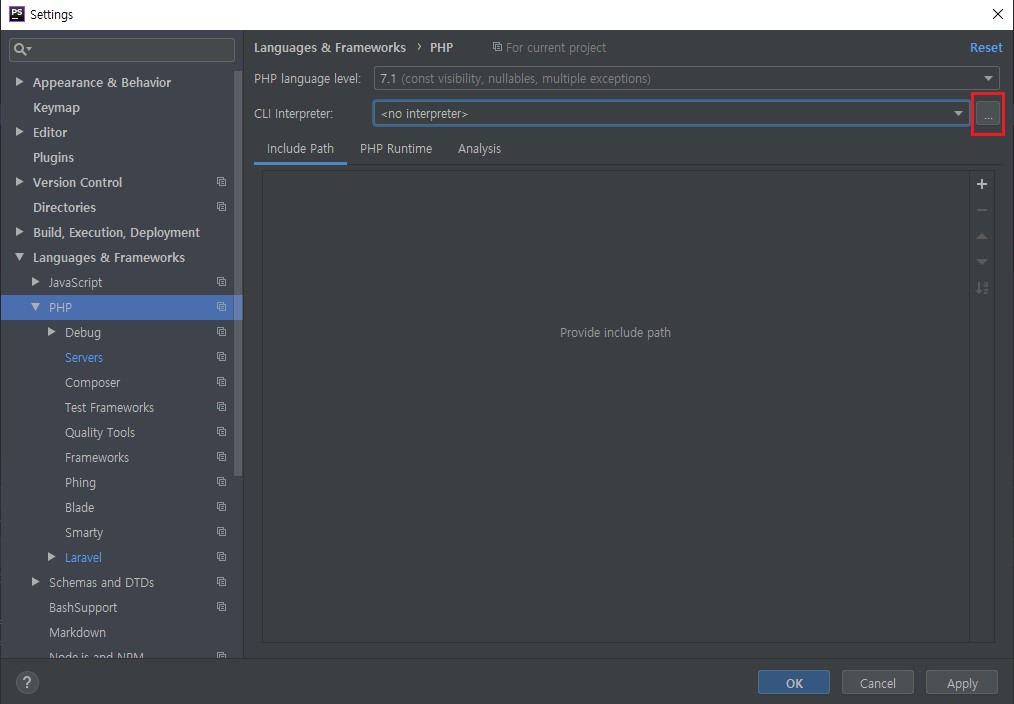 - settings->Laguages & frameworks -> php 로 갑니다.